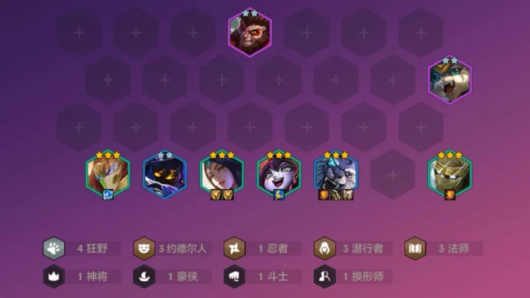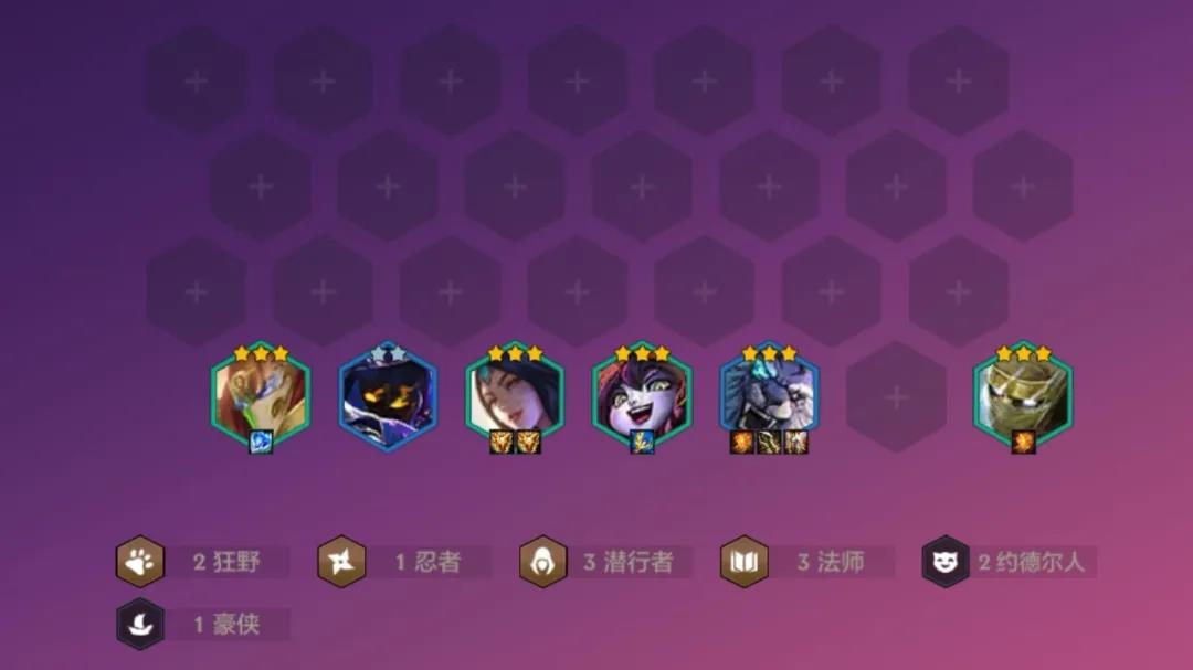 七级补上纳尔,小法、狮子狗就卡七级追三。对局时注意纳尔站位拍后排,有同行时把无同行的那个C位追到三就开始升八,补齐四狂野,全员必命中。