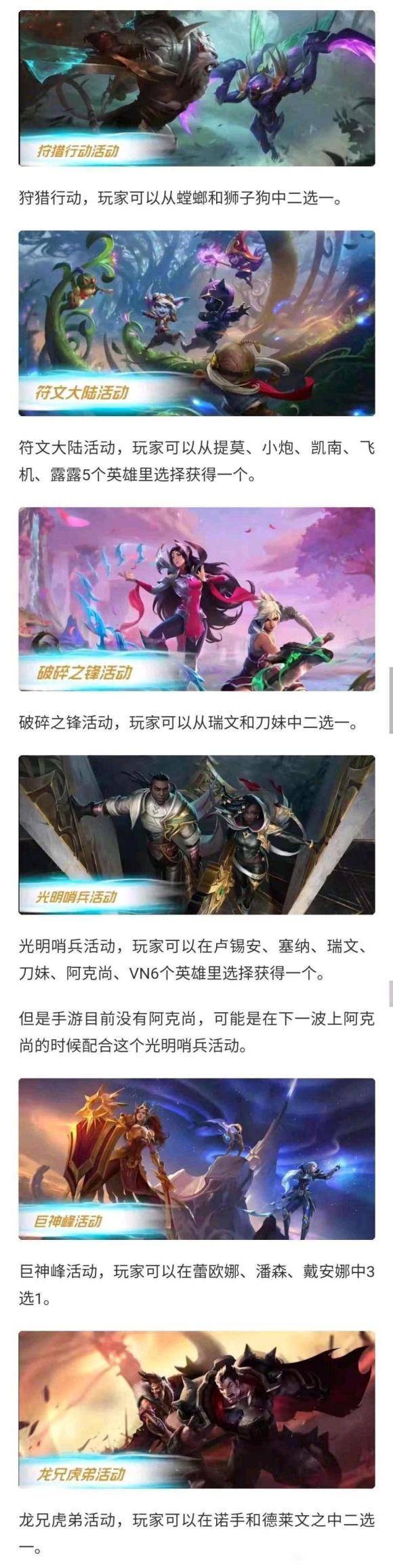 2.目前已知的后续活动中会送的英雄就是图中介绍的几位了,如果有玩家们非常喜欢的英雄,玩家们可以不用买,等到活动开始后就可以免费获得了,让玩家们节省了一笔买英雄的花费,如果选了重复的英雄就会获得一半的购买英雄的花费!