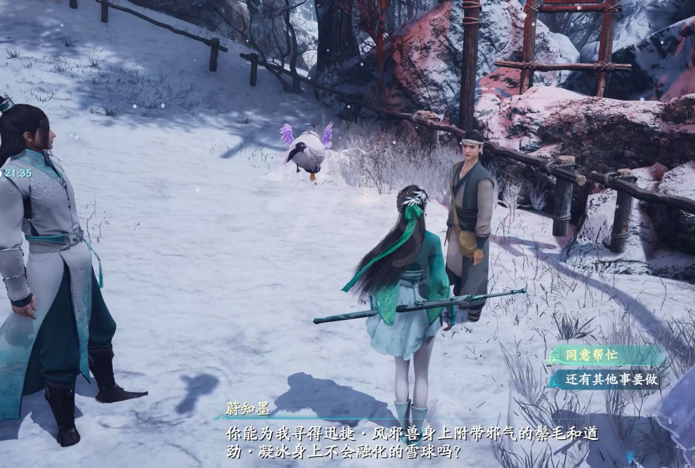 1.长白山麓的蔚知墨请求玩家帮他带回附带邪气的鬃毛和不会融化的雪球。