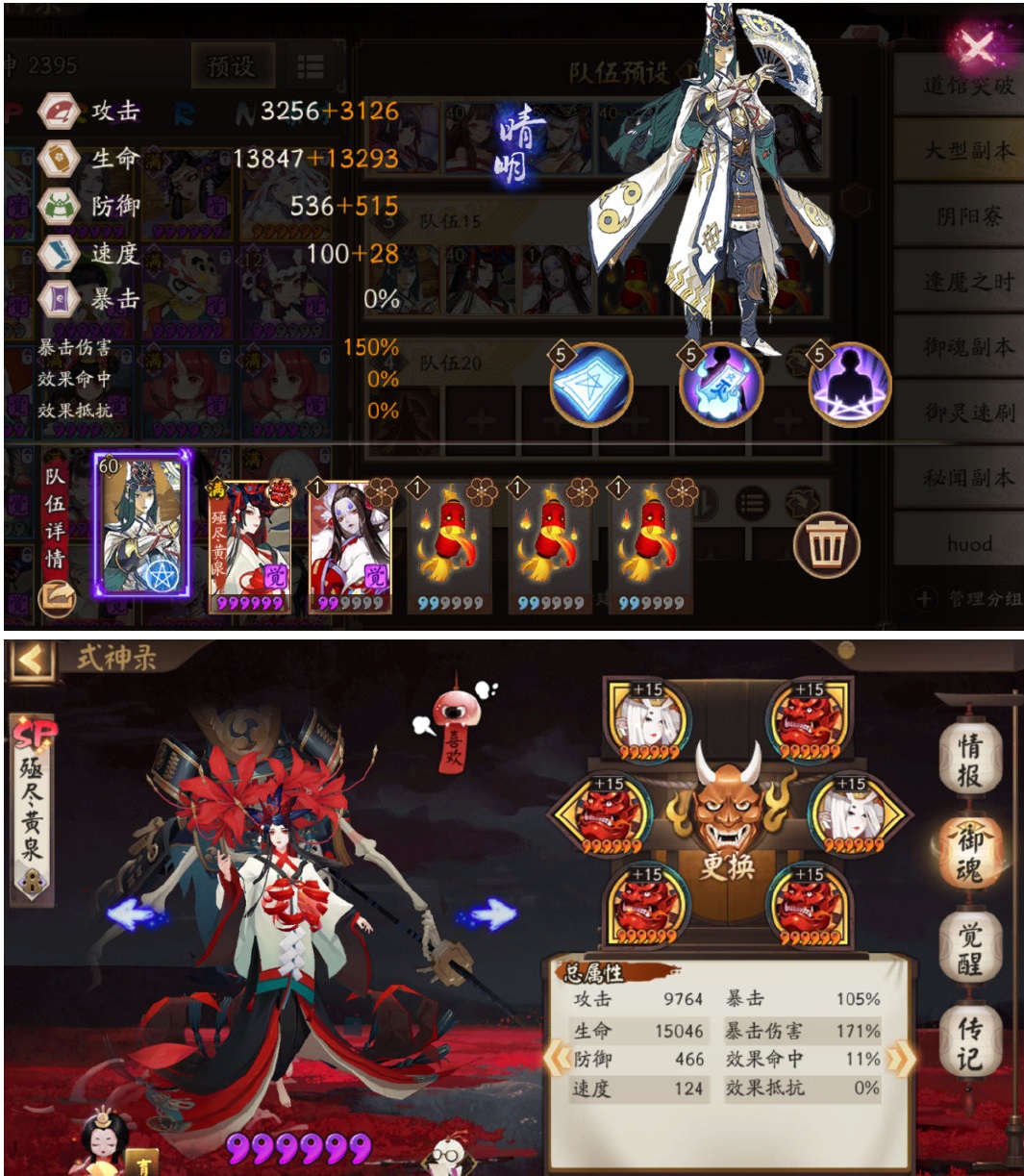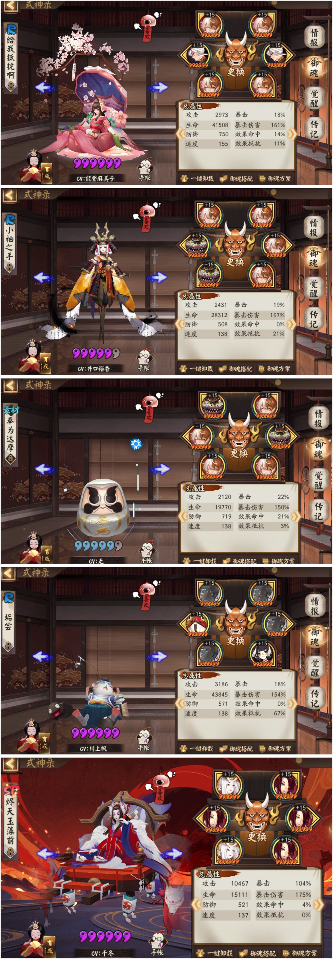 御魂及配速:椒图(招财生生生)>小袖之手(招财地震鲶生生生)>n卡(招财地震鲶生生生)>垢尝/鸦天狗(招财/涂佛生生生)>烬天玉藻前>神乐