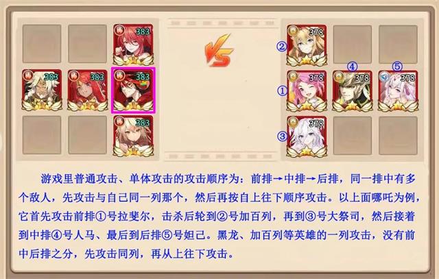 在运用阵法之前,我们要先来了解一下九宫格中英雄的攻击顺序,使我们提前在脑海中形成作战流程,便于针对防守方队伍进行布阵。