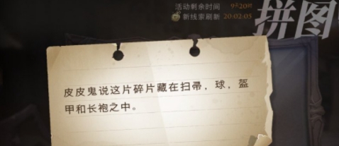 线索2:皮皮鬼说这片碎片藏在扫帚,球,盔甲和长袍之中。