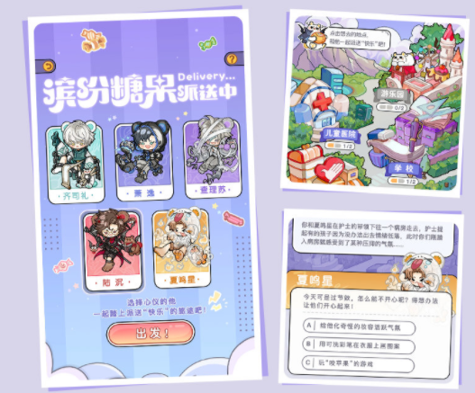 活动期间进入活动页面,选择一名男主共同探索各地,为小朋友们派发糖果,即可解锁剧情互动,获得小熊星座、道具【黄油绵绵锤】等奖励。