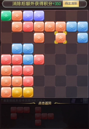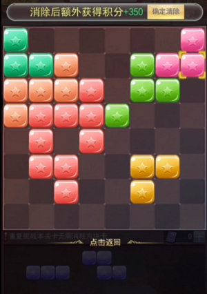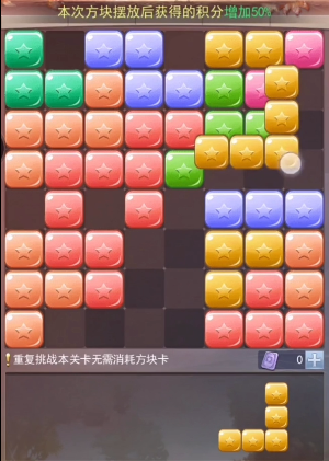 2、消除完成后继续摆放拼图,摆放成上图的样子然后使用加分卡把黄色的方块摆放在上面的位置,即可消除掉六排的方块。