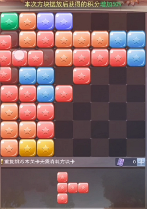 3、继续摆放拼图,摆放成上图的样子后使用最后一张消除卡消除掉上图的方块。