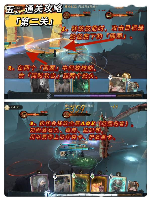 ①「如尼纹蛇」每一头为独立的个体,「有三条命」,要分别进行击败,并且会释放全屏的AOE(大范围伤害):降落石头、吼叫、喷洒毒液等。所以,建议带上治疗类、护盾类的咒语卡;