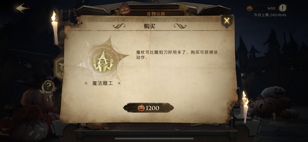 3、接下来在魔法雕工中进入到兑换中,我们只要花费一千二个南瓜币就能得到魔法雕工动作了。