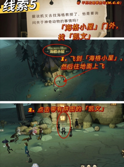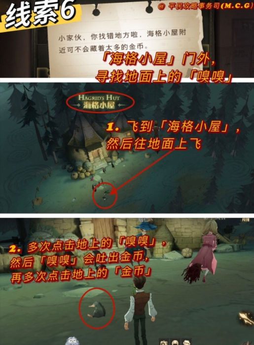 线索4:「城堡上空」默认位置,往左侧岸边飞,飞到「黑湖码头」,然后悬停在小屋前,再点击出现的「光球」(看图中箭头所指的位置)线索5:到「海格小屋」门外,飞到地面上,点击带有拼图的「凯文」(看图中箭头所指位置)线索6:到「海格小屋」门外,多次点击地面上的「嗅嗅」,然后「嗅嗅」会吐出「金币」,再多次点击地上的「金币」(看图中箭头所指的位置)其他技巧内容:
