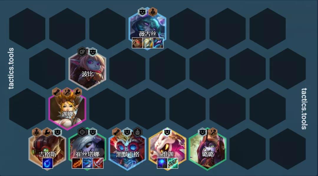 阵容组成:波比、吉格斯、崔丝塔娜、璐璐、黑默丁格、薇古丝、迦娜、维迦