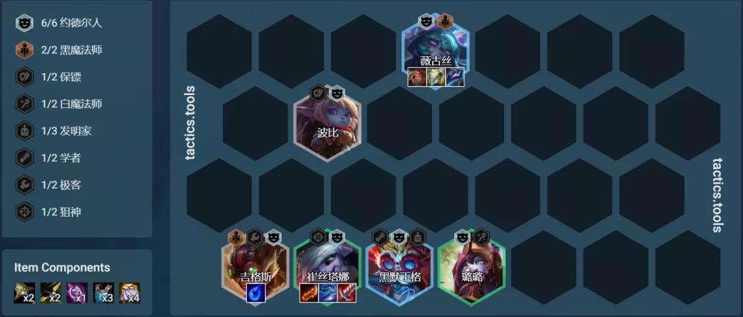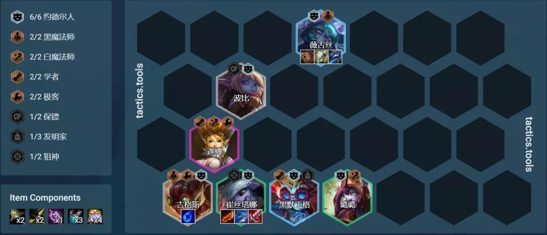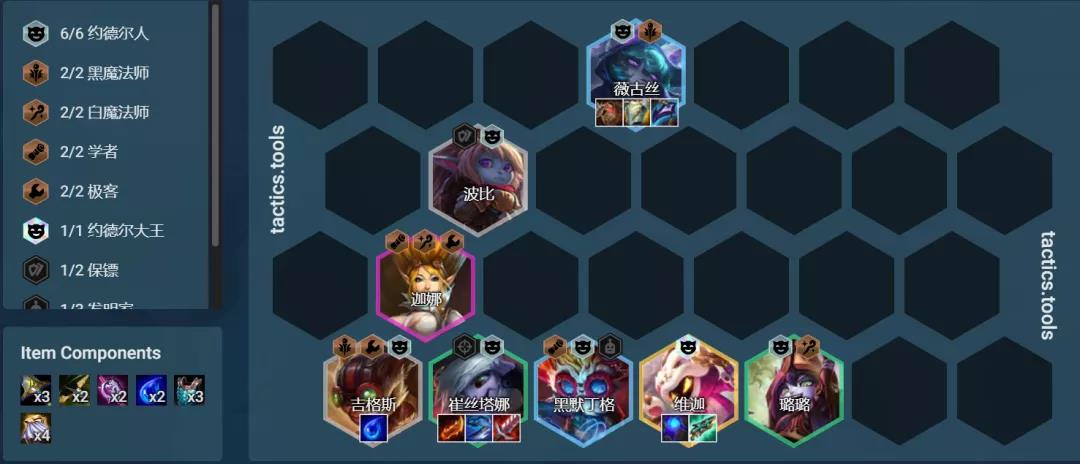 阵容羁绊:6约德尔2白魔法师2黑魔法师2学者2极客1大魔王