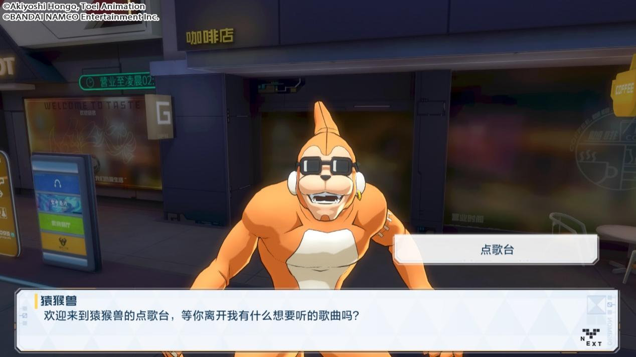 我们前往阿帕岛,与NPC猿猴兽交互后,它会欢迎你来使用这个全新的功能——点歌台,随机跳出点歌台的选项,在选择列表中我们能够选择音乐,诸如数码宝贝新世纪的主题曲《零:开始的地方》,在本作的主角们也会倾情献唱。