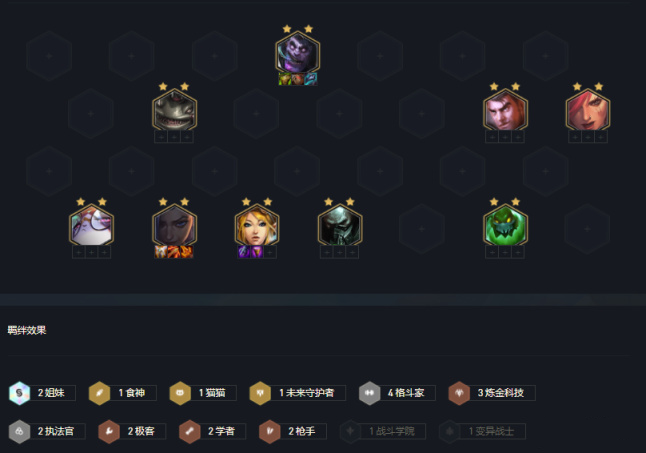 7发明的龙无比强势输出与坦度极高,如果有海克斯强化自我修复直接无敌,死了还能复生,如果没有发明家羁绊转职、心、魂基克5发明+4学者或5发明3白2发条,如果输出装备多也可考虑上烬当输出主C,强度依然爆炸。