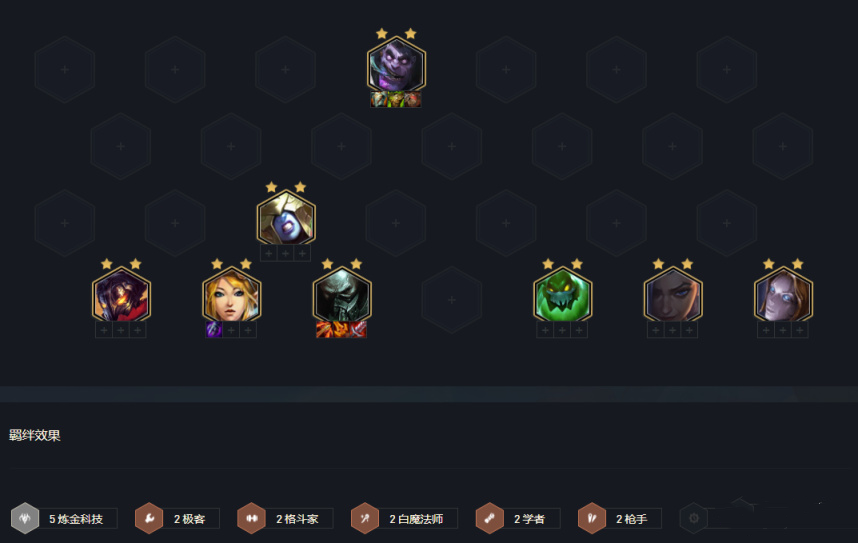 棋子构成:蒙多、丽桑卓、维克托(可换其他任意炼金)、迦娜、厄加特、扎克、金克斯、奥利安娜。