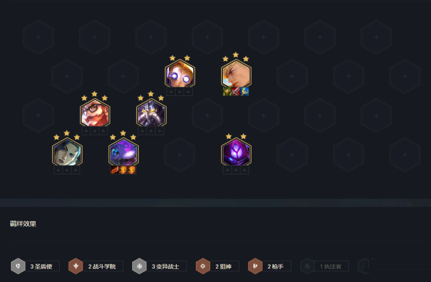 棋子构成:格雷福斯、盖伦、塔里克、机器人、雷欧娜、卡萨丁、拉克丝、迦娜