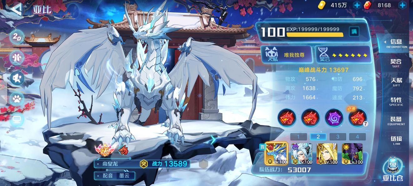 3、对面阵容帝俊、弗丽嘉、修罗,用队伍1,首发亚当+132,重点就是帝俊的嘲讽。亚当要是没有水晶刚好被嘲讽被集火秒了就重开。对面阵容奇灵王、九色鹿、后羿,用队伍2,首发帝皇龙+天使王。帝皇龙死了就重开,帝皇龙站住了基本稳了,优先击杀九色鹿,然后后羿,最后打奇灵王。