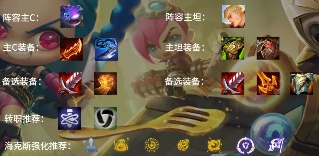 开局装备优先拿腰带,腰带开局才是正确的玩法。前期一定一定要做狂徒铠甲,这个装备是前期盖伦连胜的关键。前期留女警>大嘴,2星女警只要前排够肉的情况下,一把比赛最少能够带走1-2个英雄。
