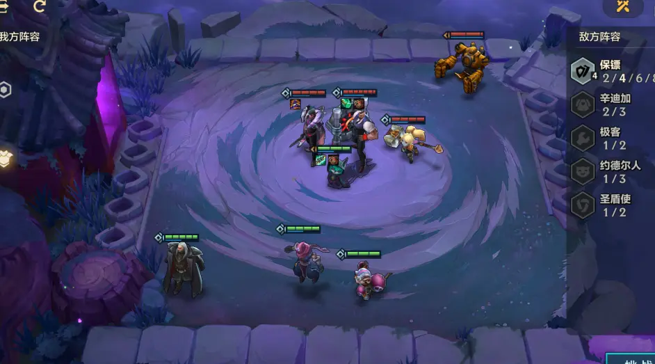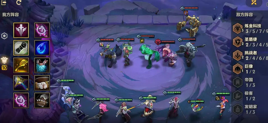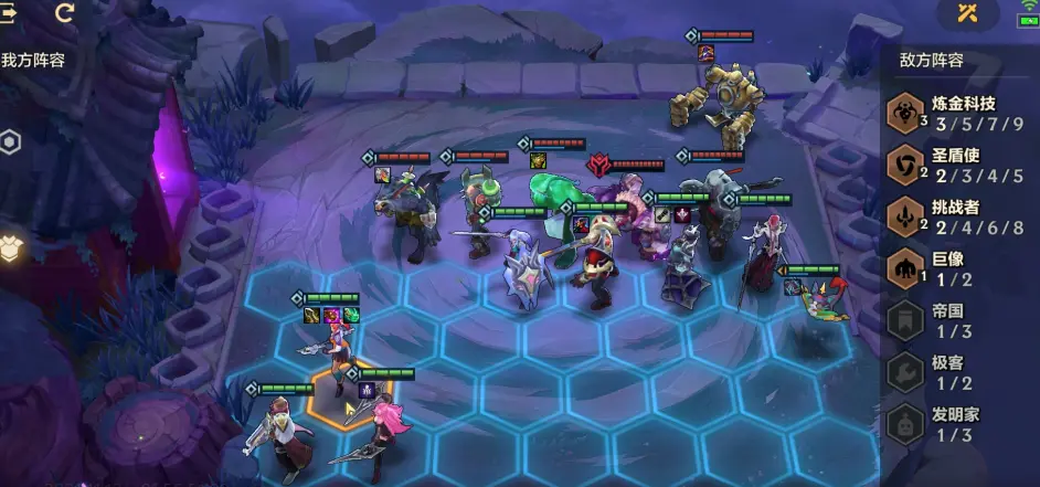 对面是3炼金+2圣盾+2挑战者羁绊,我方8枚棋子7战争学院+2圣盾羁绊。