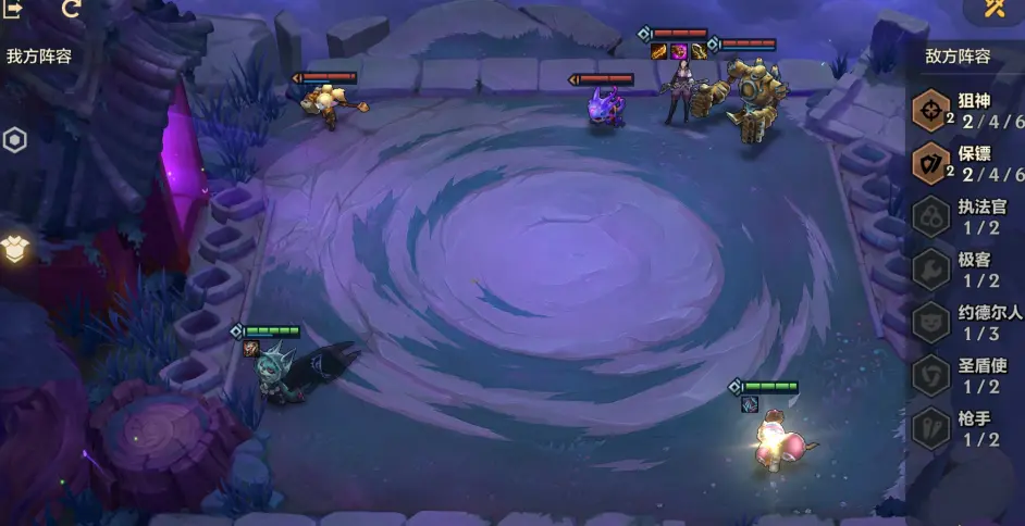 敌方4枚棋子2狙神2保镖羁绊,凯特琳神装,我方只有两枚棋子2黑魔法师,薇古丝和吉格斯。