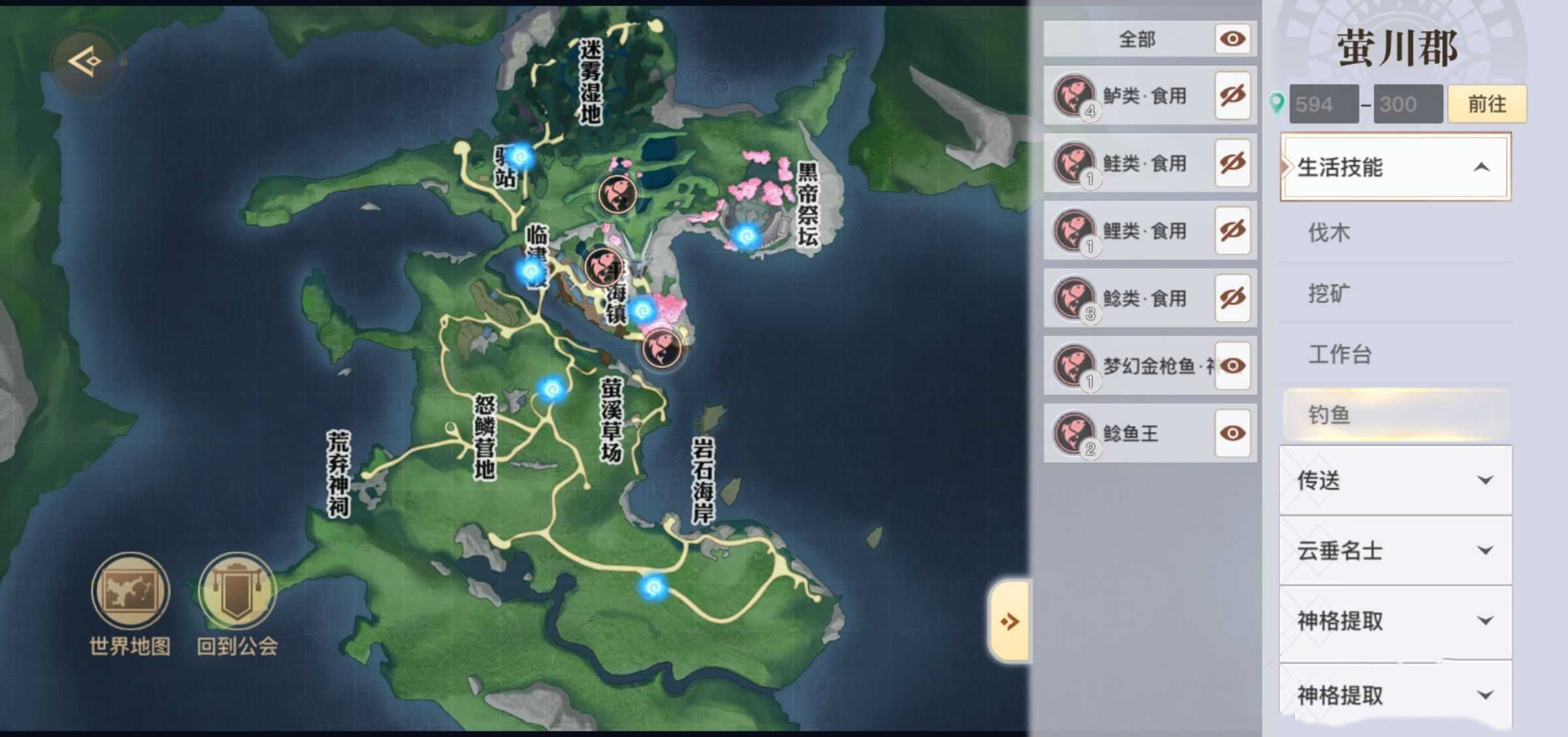 2、开区之后所有的鱼点会刷新,伞村和萤川的点没有变化。