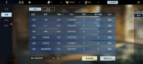 而在成员栏则可以看到目前公会中的所有成员,可以根据等级、评分、活跃以及累计贡献、在线状态来进行排序,方便更快的定位需要寻找的玩家,在公会达到一定职位,还将获得招募移除成员的管理权限,在这里同样也可以办理退出公会。
