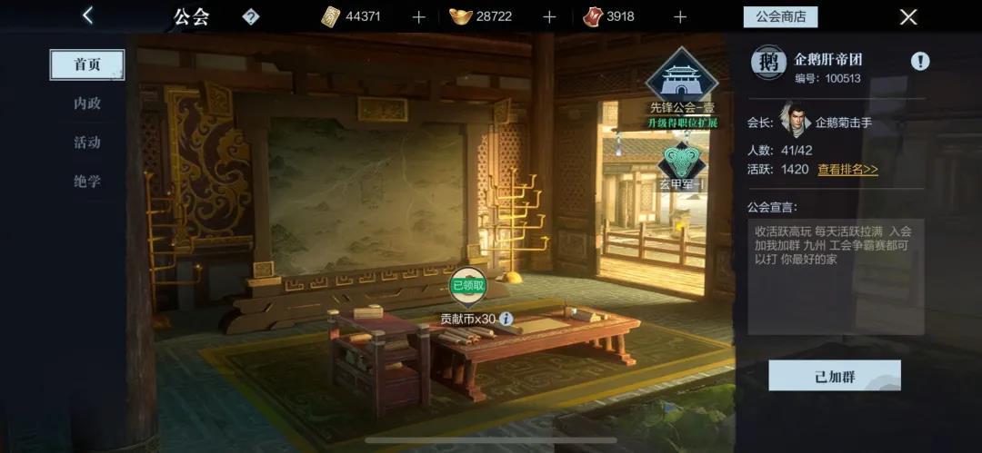 进入公会玩法,首先能看到的就是【首页】中的本公会信息,能够直观地看到公会名称,会长玩家,和公会人数,除此之外,还能进一步查看公会的全服排名和公会等级,该页面也是公会的每日签到页面,每日可点击领取一定数量的公会贡献。