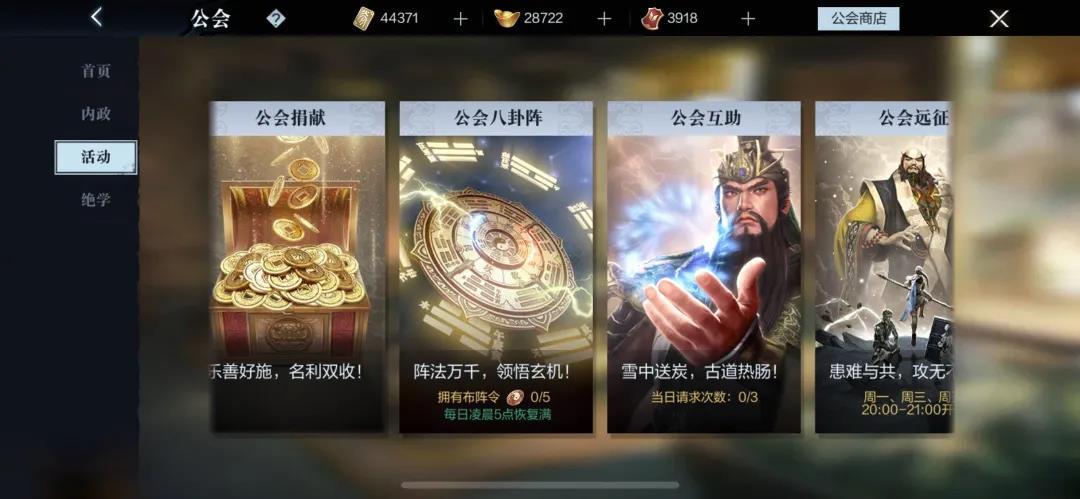 除了能够进行捐献壮大公会,在公会活动中,还有公会互助玩法,在这里可以捐助其他成员武将碎片,也可以发布求助请求,霸哥就经常在心仪的武将碎片收集到49个时,收到来自同公会成员的捐助,那简直是雪中送炭了,捐献和互助玩法可谓是诠释了公会集结群英,协力发展的真谛。