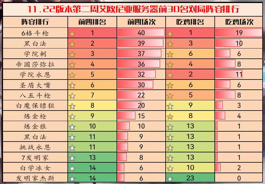 阵容吃分前三强为:6格斗枪、黑白法与学院刺,吃鸡场次前三强是6格斗枪、学院永恩与黑白法。