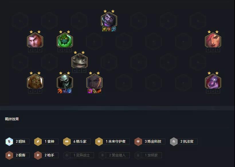 阵容对海克斯强化要求非常低,大部分都能用,最优格斗家/炼金之心/魂,神枪手 泰坦之劲,高端购物等。