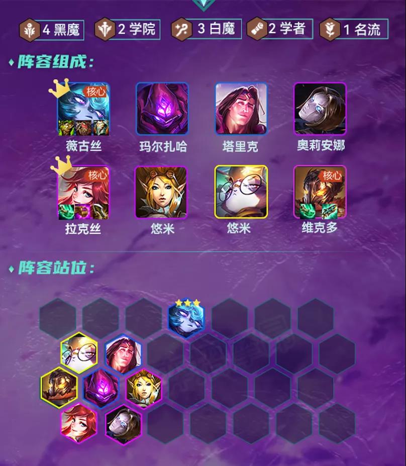 虽说阵容黑魔法师越多阵容越暴力,但阵容关键还是坦度与续航,2白魔法师到4白魔法师看对局情况选择,在有学者羁绊后也可开2社会名流,来增强全队的法力恢复。