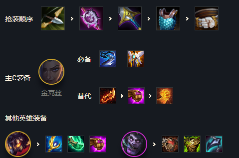 前期的话优先做金克丝的装备,可以给狼人,老鼠过度。