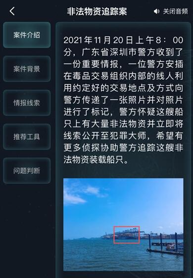2021年11月20日上午8:00分,广东省深圳市警方收到了一份重要情报,一位警方安插在毒品交易组织内部的线人利用约定好的交易地点及方式向警方传递了一张照片并对照片进行了标记,警方怀疑这艘船只上有大量非法物资并立即将线索公开至犯罪大师,希望有更多侦探协助警方追踪这艘非法物资装载船只。