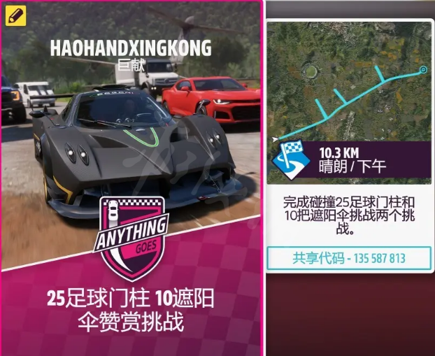 所以制作了蓝图一次性解决两个挑战,蓝图代码135 587 813,在高速上行驶,没必要跟着AI,接近碰撞物时速度不要太快,掌握好方向即可。门柱设置总数30个、遮阳伞20把。车辆等级和类型不限。