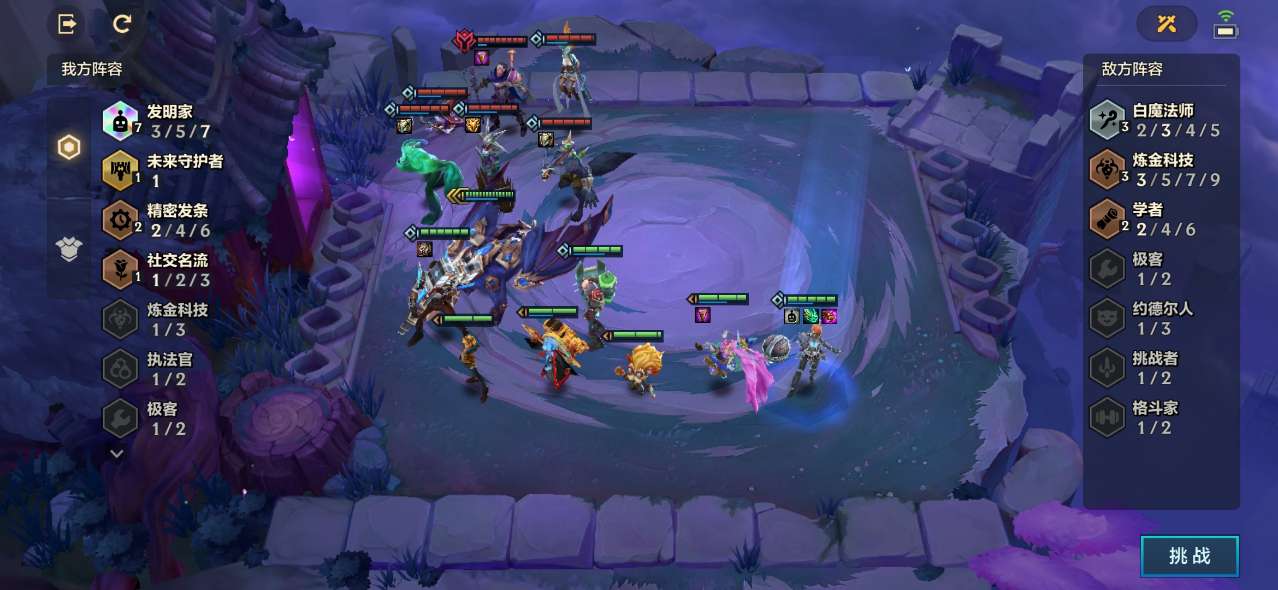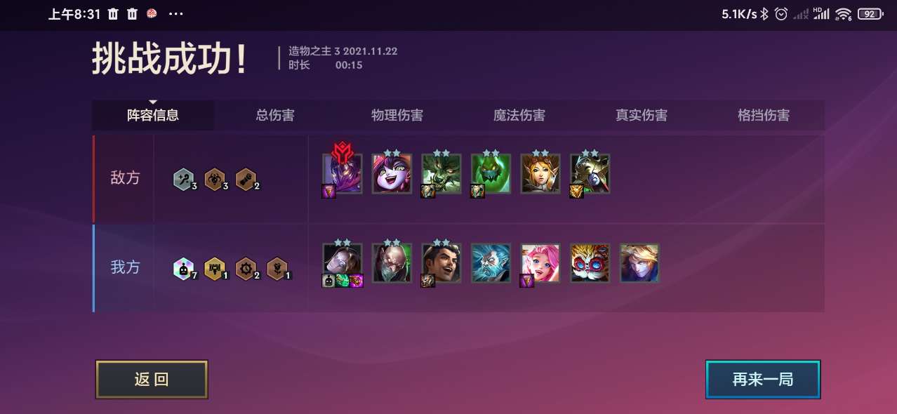 1、这一关对面羁绊为4保镖和2圣盾使,我方羁绊为3发明家和1社交名流,虽然对面羁绊很肉,但是却没伤害。