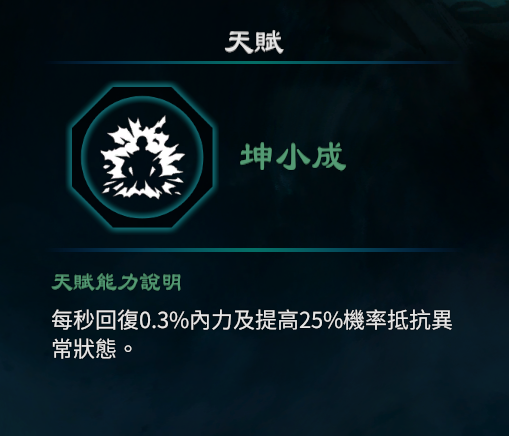 3.每秒回复0.3%内力及提高25%机率抵抗异常状态。