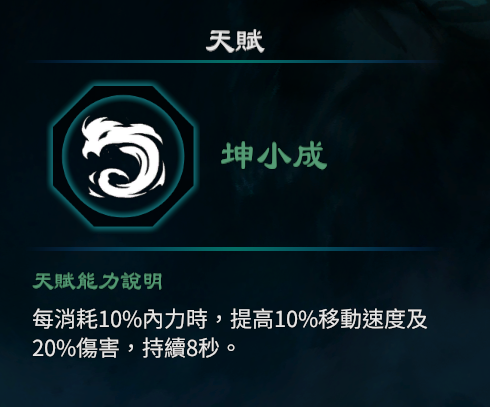 2.每消耗10%内力时,提高10%移动速度及20%伤害,持续8秒。