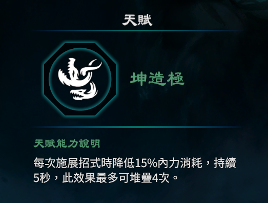1.每次施展招式时降低15%内力消耗,持续5秒,此效果最多可堆叠4次。