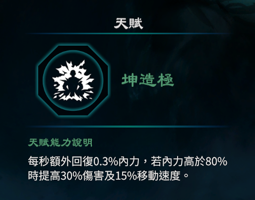 3.每秒额外回复0.3%内力,若内力高于80%时提高30%伤害及15%移动速度。