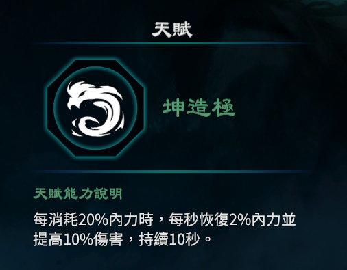 2.每消耗20%内力时,每秒恢复2%内力并提高10%伤害,持续10秒。