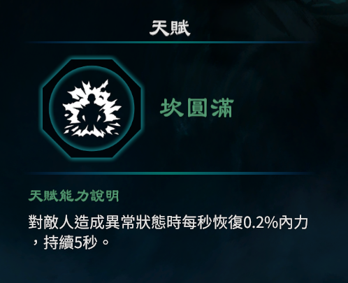 3.对敌人造成异常状态时每秒恢复0.2%内力,持续5秒。