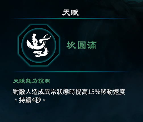 1.对敌人造成异常状态时提高15%移动速度,持续4秒。