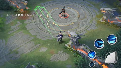 妖狐挥舞折扇发出气刃,对第一个命中的敌方单位造成50(+70%攻击)点物理伤害,若命中敌方式神,自动发射一发追踪气刃造成10(+60%攻击)点物理伤害并附带普攻特效。