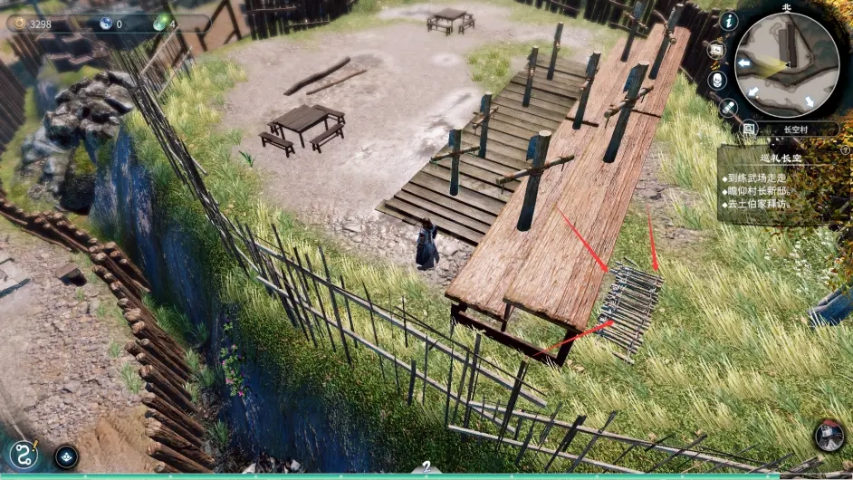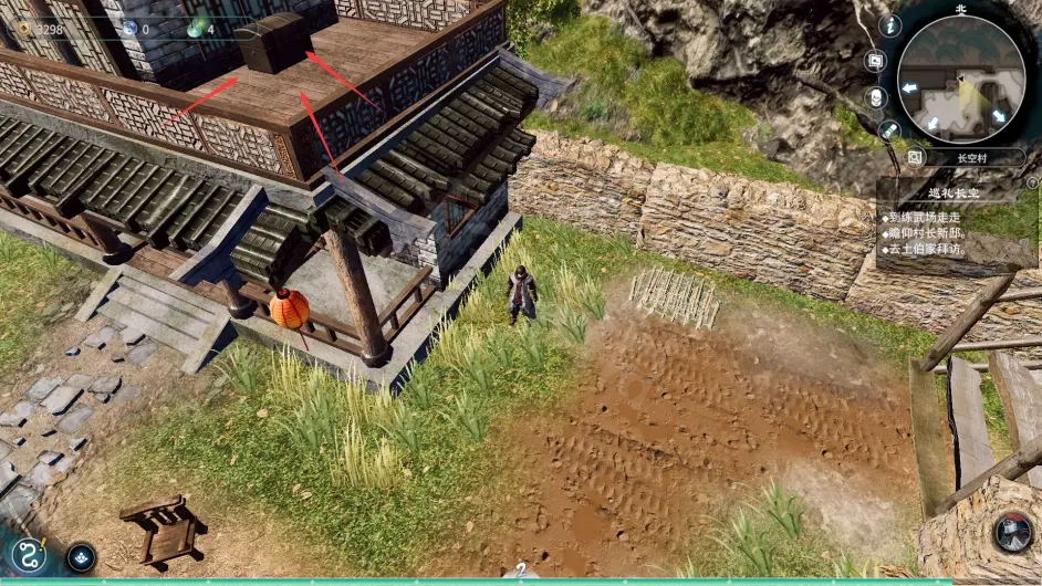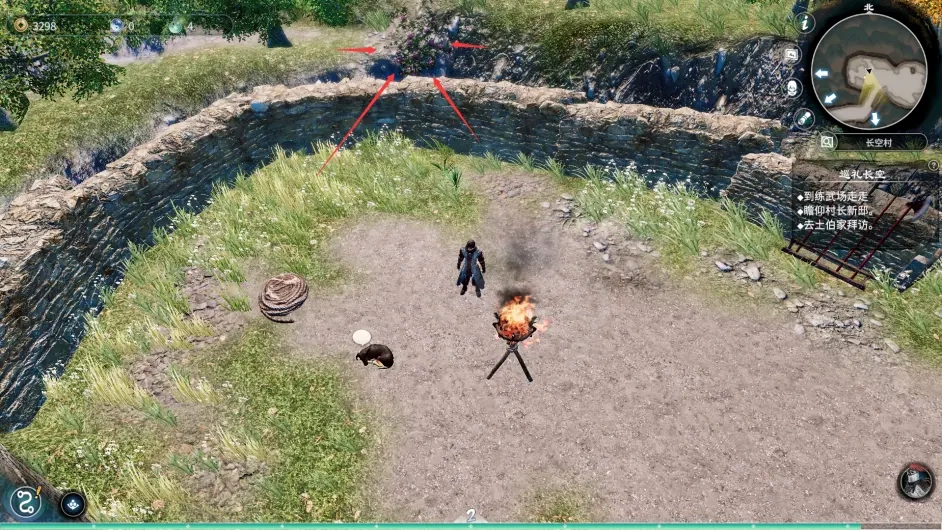 3.河边有两道坑,再两道坑里全摆入【粗米】,注意两个坑都要,然后在米旁边放上笼子,就可以抓贪食鸡。三只鸡全抓到了之后会触发抓母鸡的任务。最后母鸡提交的越多,给的奖励越好,目前一共有三只母鸡。其中一只在刚才点火的草丛里,一只在练武场的箱子里,还有一只在集市的杂货摊后面。 抓完母鸡之后,就可以开鸡舍的宝箱了,给个拳套。