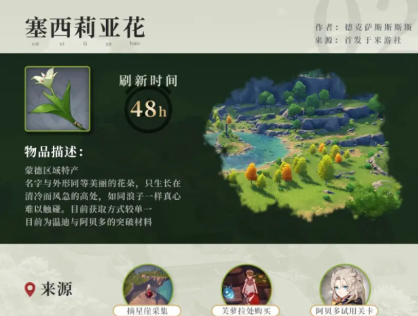 2.蒙德城花语店主芙萝拉处购买(1000摩拉每个,三天刷新一次,限购五个)
