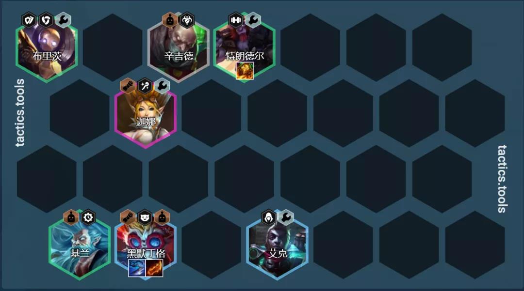 7人口小D20-30金币,更换一下阵容过渡。中期因为只有2星EZ打工的话,阵容的坦度会大幅度下降,因此我们可以考虑使用黑默丁格作为发明家的打工工具。7人口只要凑出4极客3发明家羁绊即可,其他英雄可以随意搭配。
