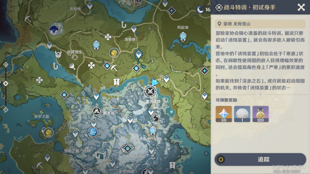 3、第二个觅踪训练:完成后可获得雪人部件。就是找到八处大冰坨坨融化,每块冰坨坨里会有雪人零件,或者野猪或者蝴蝶等