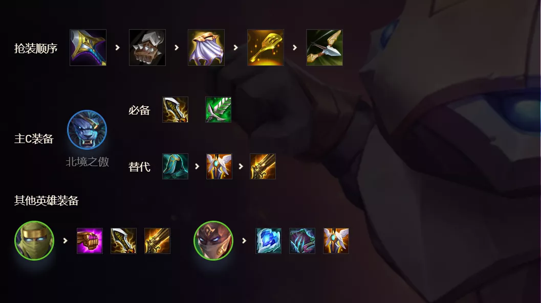 前期抢等级打连胜,保证后期有更多的血量和容错率去追三星北境之傲,阵容羁绊3换型队伍整体也比较肉,控制的话有狻猊之心和海上幽影,未来守护者,高爆发的影疾忍,和北境之傲的持续输出,加上4狂野的羁绊,全队物理必中,和攻速狂野叠加。使得这套阵容极为全面。