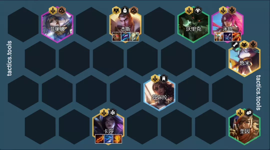 阵容组成:奎因、莎弥拉、沃里克、菲奥娜、永恩、杰斯、悠米、卡莎