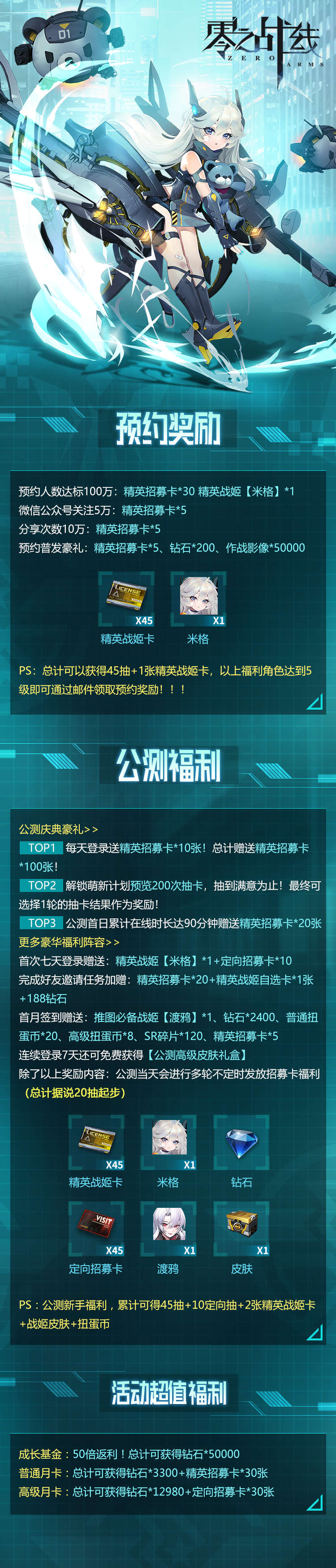 《零之战线》公测之际,指挥官初次降临蓝星,每天登录即领精英招募卡*10张,总计10天赠送100张精英招募卡!而公测首日只要累计在线超过90分钟,另有20张精英招募卡派送!