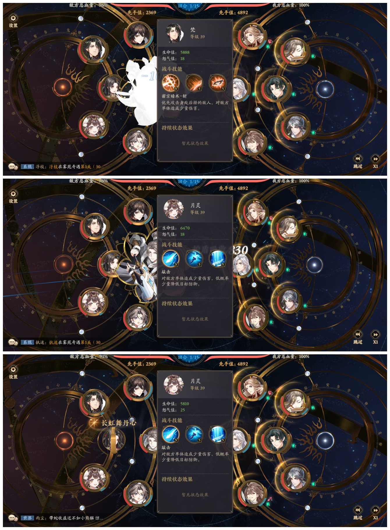 解释一下为什么小季站三号位很重要,因为陵是攻击血量最少的单位,开局对面四号位血量是低于奶妈的,而小季是攻击对面一列两个人,这样开局就压低了奶妈血线让陵直接切奶妈(小季的攻击力得达标,普通攻击一次将奶妈血打至比四号位更低,如图)。当然如果你练的是玉泽的话直接站六号位就好了,小季站位无要求。没有小季的把他换成攻击一列能打残奶妈的也行。