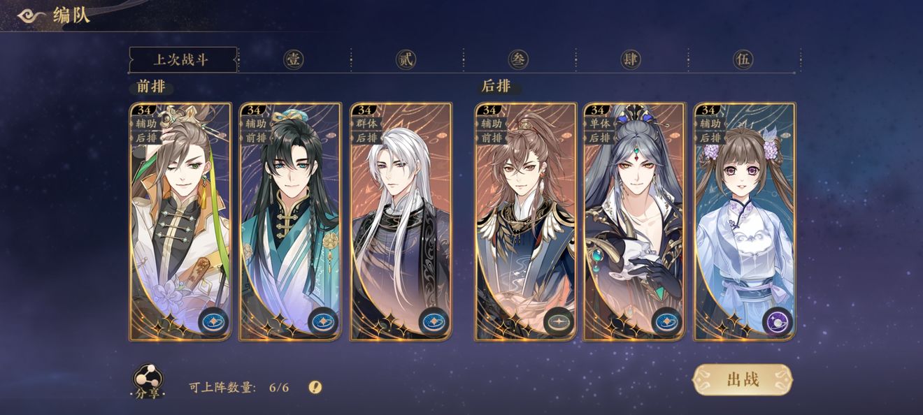 2、站位(练的是别人推荐的双0怒攻流)。桃山客一号位,贺之洲二号位,凌宴如三号位,小季四号位,陵五号位,蕊儿六号位。
